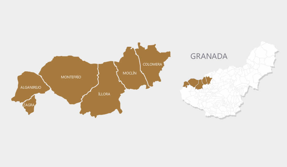 Algarinejo, Colomera, Íllora, Moclín, Montefrío y Zagra, una tierra de fortalezas, homogénea funcionalmente, que históricamente ha sido puerta de entrada a nuestra provincia y que actualmente se encuentra enclavada entre el Poniente Granadino y los Montes Orientales, denominándose de esta forma, Montes Occidentales, los cuales marcan claramente esta frontera natural en el territorio entre nuestra provincia y las provincias de Córdoba y Jaén.